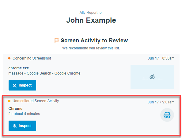 To counteract this, our system reports any use of private browsing on an Android device. When private browsing has been detected, the next report email will automatically include “Review is Recommended for…” in the subject line. Furthermore, when private browsing (a.k.a. incognito mode) has been used, an “Unmonitored Screen Activity” entry will appear in the next report (see the example below). Because private browsing is designed to ensure nothing from an online session is logged in a person’s browser history or search history, it’s important that allies know when it’s being used.