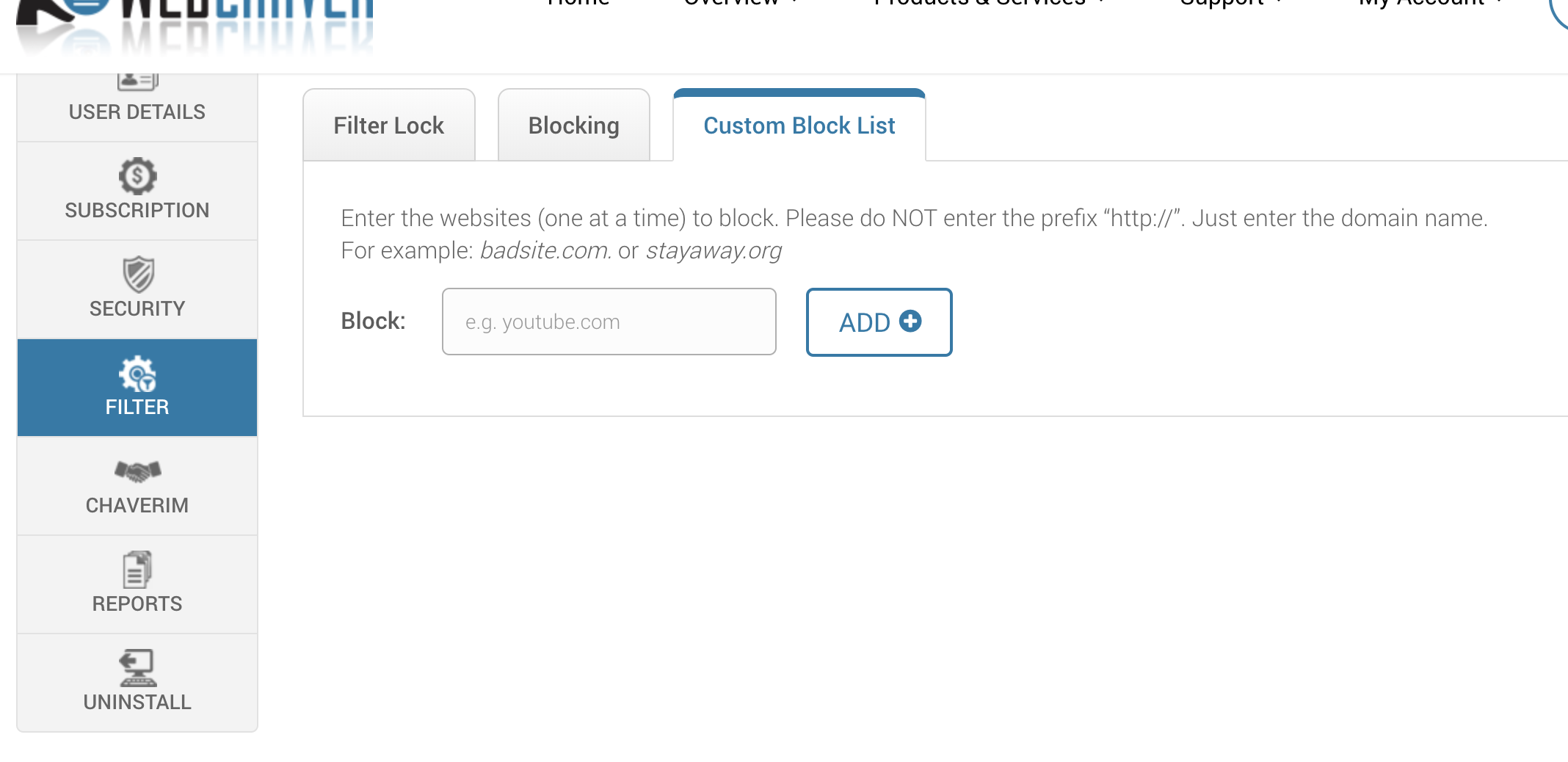 Now, type in the website you want to block and click the blue “Add” button. If the entry is not a valid domain, you will see a message.